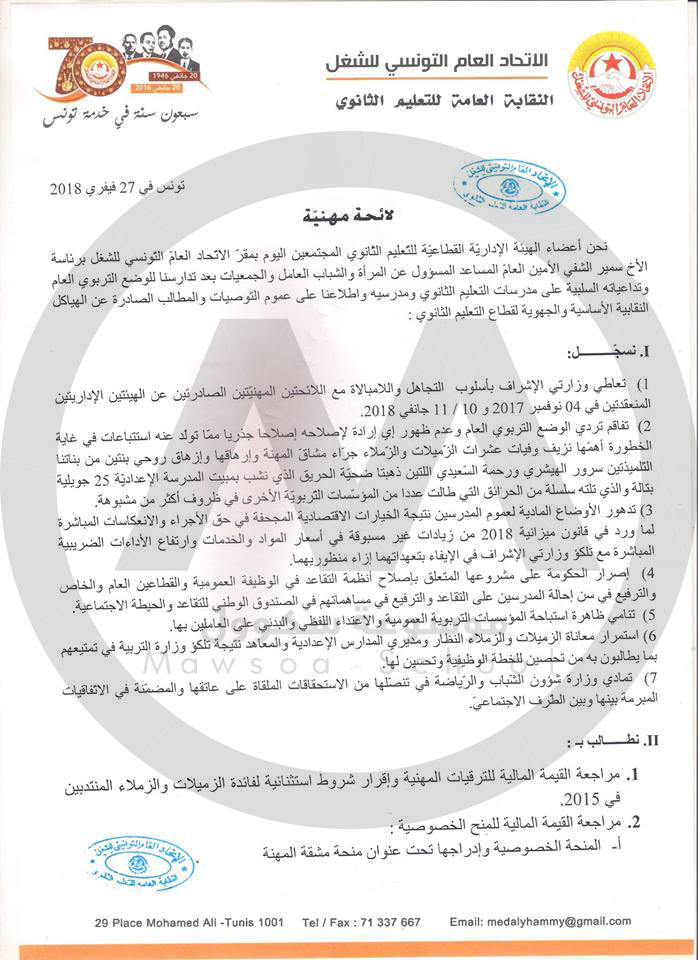 وفي نفس السياق، اكدت النقابتان (النقابة الاساسية للتعليم الابتدائي والنقابة العامة للتعليم الثانوي) أنهما ستقيمان يوما 2 ديسمبر 2016 و3ديسمبر 2016 بجلسة ادارية للنظر في الاشكال النظالية القادمة التي ستكون تصعيدية على حد قولهما.